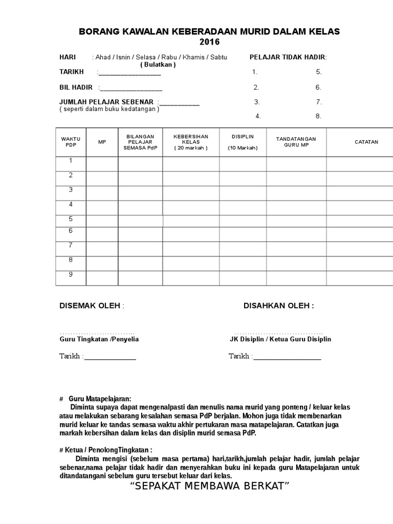 Contoh Borang Kawalan Kelas