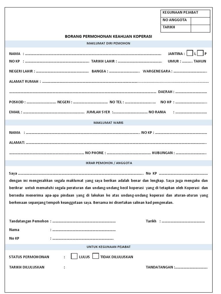 Contoh borang keahlian koperasi sekolah. Menurut surat keputusan bersama antara menteri perindustrian menteri koperasi menteri pendidikan dan kebudayaan dan menteri dalam negeri no. Koperasi sekolah sma negeri 12 medan didirikan oleh para komite sekolah pada tahun 2014 yang memberikan solusi dalam menagatasi kesulitan untuk mendapatkan bantuan permodalan karena pada umumnya mereka mengelola usahanya secara tradisional untuk sekolah. Maka dari itu pihak sekolah khususnya bagian pengadministrasian harus memiliki format surat keputusan kepala sekolah secara lengkap. Koperasi sekolah adalah koperasi yang didirikan di lingkungan sekolah yang anggota anggotanya terdiri atas siswa sekolah koperasi sekolah dapat didirikan pada berbagai tingkatan sesuai jenjang pendidikan misalnya koperasi sekolah dasar koperasi sekolah menengah pertama dan seterusnya adapun koperasi sekolah juga dapat dimaknai sebagai koperasi yang berada pada lembaga pendidikan lain.