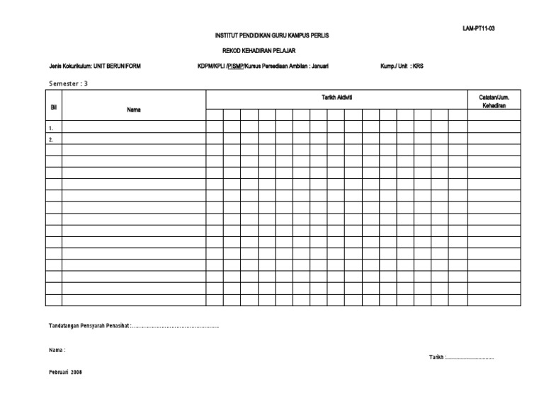 Contoh borang kehadiran kursus. Program kursus dan pelatihan seharusnya memiliki penyusun silabus 3 1 3. Borang pk 07 2 senarai kehadiran mesyuarat doc. Seminar pengurusan pengetahuan bagi pegawai perkhidmatan gunasama persekutuan gred 41 54 created date. Sesi perkongsian ilmu sila sertakan senarai kehadiran peserta semua dokumen yang tersenarai di atas yang telah lengkap hendaklah disertakan bersama borang tuntutan e claim bagi kelulusan yang menggunakan vot latihan sepenuhnya.