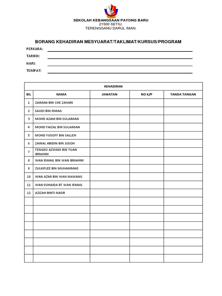 Save save contoh borang kehadiran mesyuarat for later. Mesyuarat kurikulum bilangan 1 2014. Kehadiran ibubapa penjaga hadir tidak hadir tandatangan catatan. Carousel previous carousel next.
