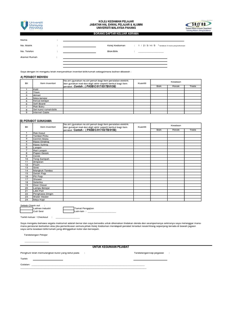 Contoh Borang Keluar Asrama