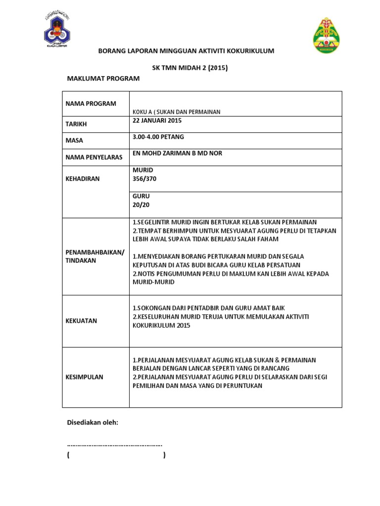 Format laporan aktiviti kokurikulum setiap minggu. Borang laporan perjumpaan mingguan borang semakan keahlian kokurikulum tahun 4 2012 borang rumusan markah kokurikulum borang instrumen pemantauan aktiviti kokurikulum hari rabu borang instrumen pemantauan kokurikulum jps borang instrumen pemantauan 1murid 1sukan kpm borang permohonan membuat lawatan.