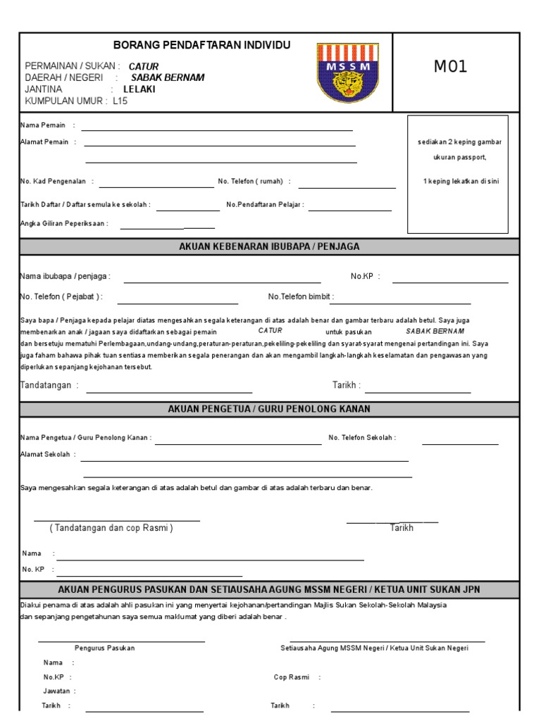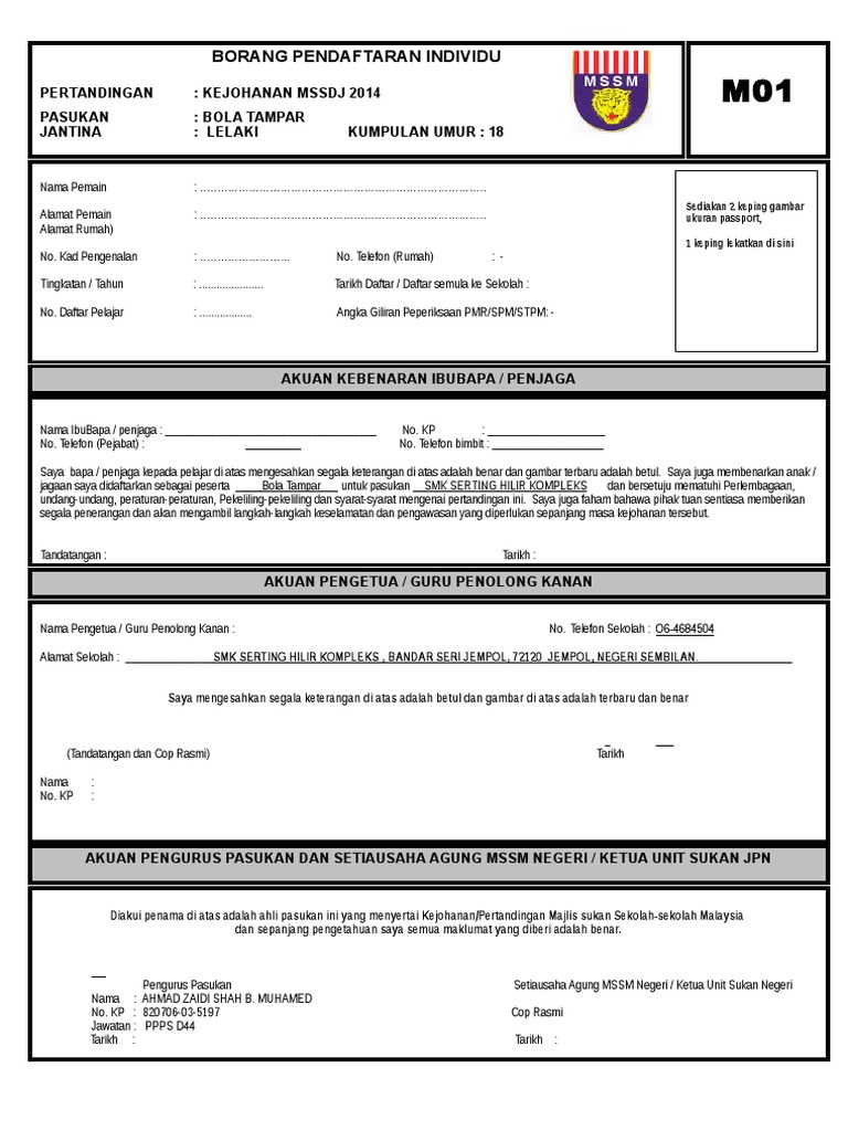 Borang m01 dan borang m02 borang pendaftaran merentas desa rasmi borang m01 individu. Borang pendaftaran pasukan mssm permainan sukan. Hanya isi data dan borang ini akan auto fill atau automatik isikan data ke borang m01 dan m02 setelah data peserta dan pegawai telah lengkap diisi. M02 bil nama pegawai jawatan sekolah 1 2 3 4 5 6 bil nama pemain no.