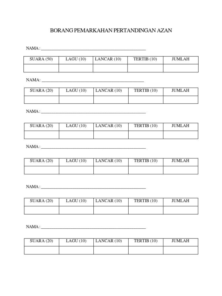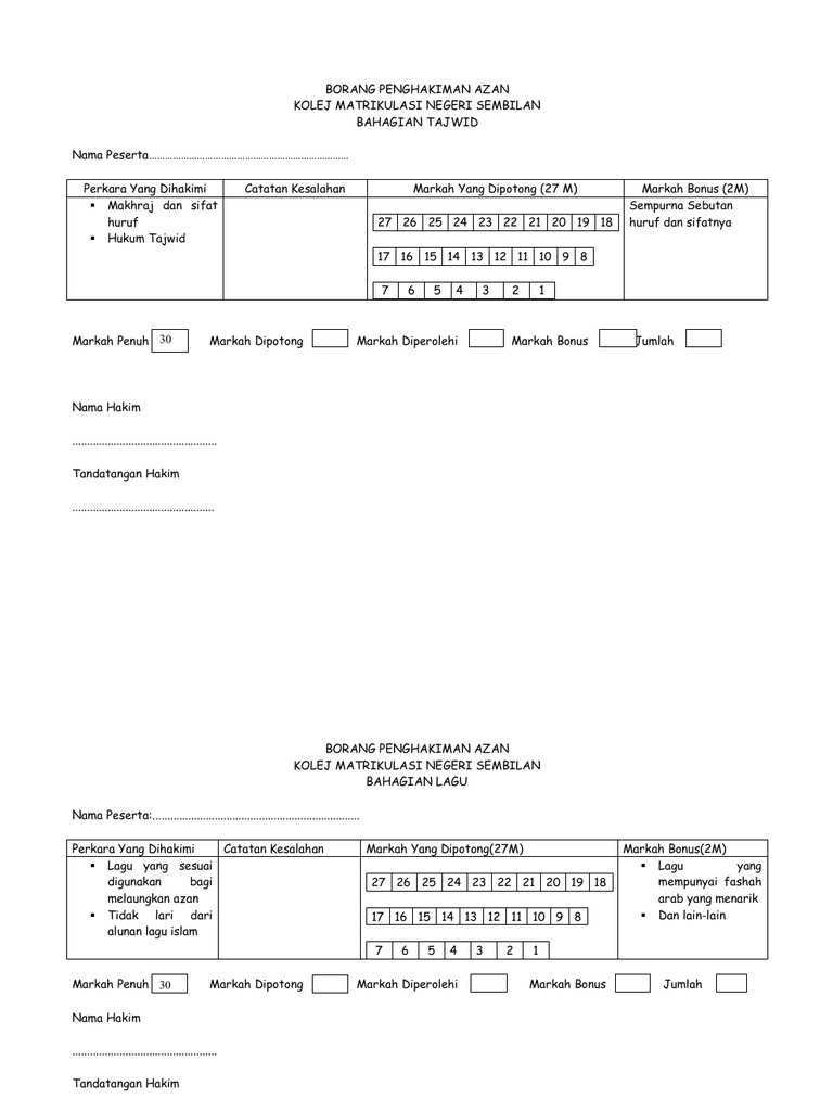 Contoh Borang Pemarkahan Azan