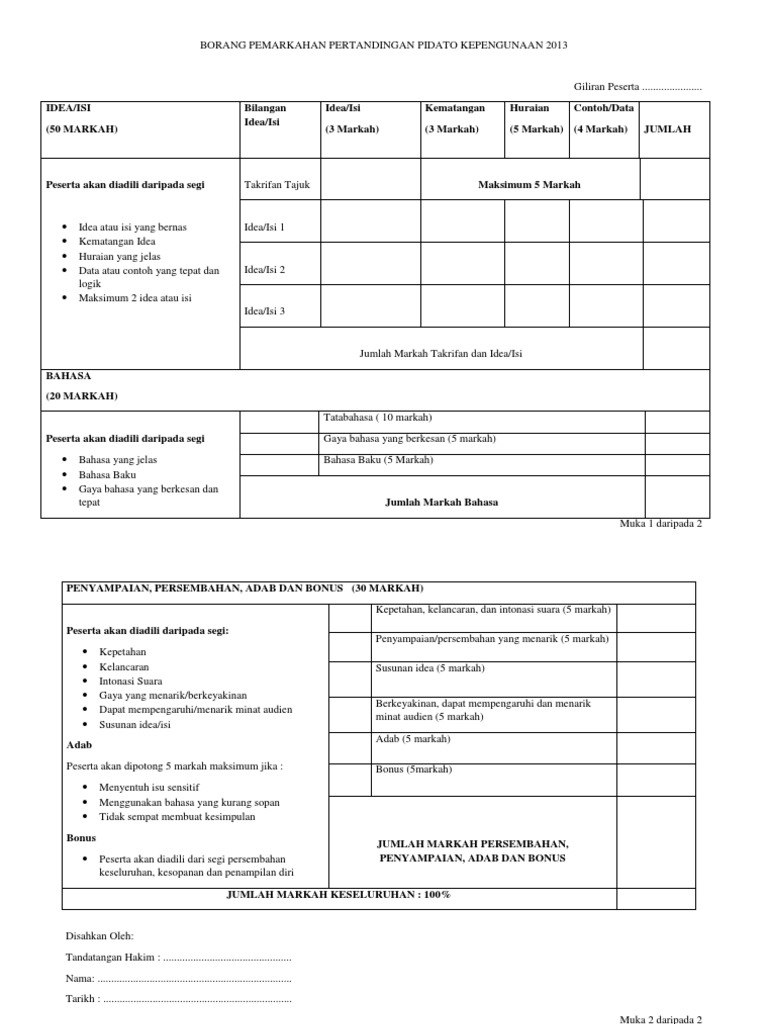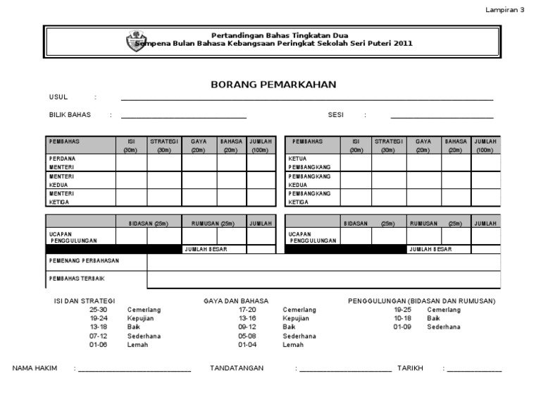 Contoh borang pemarkahan debat. Rujukan untuk borang pemarkahan 10 1. Selamat datang diucapkan kepada semua pengunjung blog rasmi program debat bahasa melayu 100 jam tanpa henti ini. Namun begitu bidasan yang dibuat harus berdasarkan intipati hujah dan bukannya berdasarkan contoh dan analogi. Laman ini ditubuhkan sebagai satu usaha untuk memudah pengurusan dan penyebaran maklumat tentang karnival bahasa 2012 peringkat negeri sembilan semoga pengurusan sepanjang pertandingan berlangsung berjalan dengan lancar dipermudahkan serta mendapat keberkatan allah.