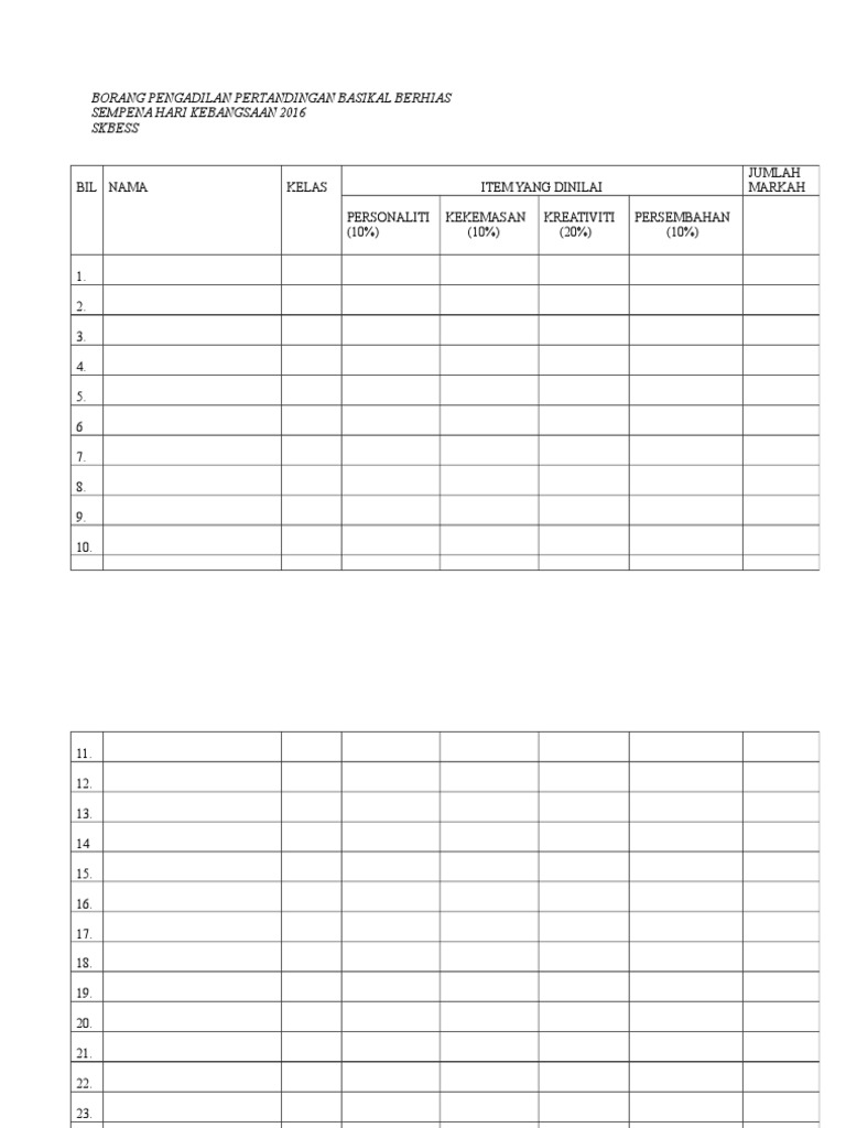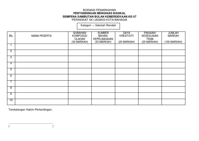 Pemenang basikal berhias sempena bulan kemerdekaan. Pertandingan koir sekolah rendah menengah negeri perak tahun 2014 borang pemarkahan hakim giliran. Borang pemarkahan pertandingan nyanyian solo. Panduan pemarkahan pertandingan kelas jiwa merdeka.