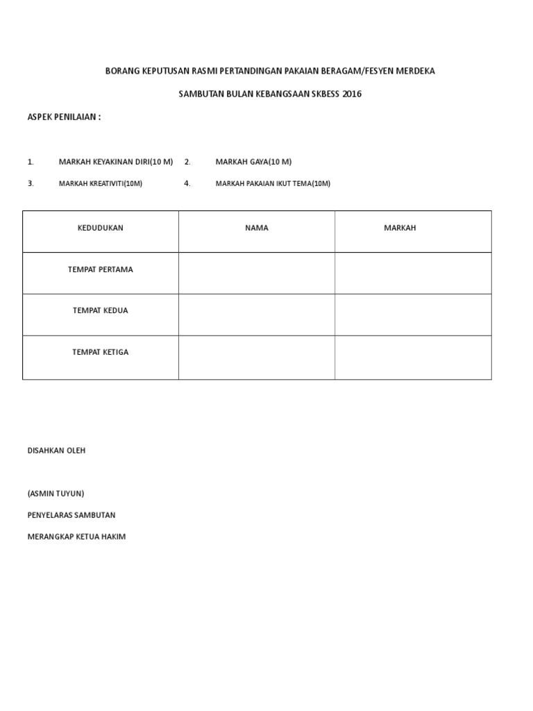 Contoh borang pemarkahan pertandingan fesyen. Borang ini perlu dihantar dan dikembalikan semula kepada pihak uruetia pertandingan sebelum ataupun pada 3 mac 2014. Pertandingan ini disaksikan oleh semua warga sk bukit rokan lktp. Peserta yang lewat akan dibatal penyertaannya. Lain lain agensi kerajaan agensi swasta individu sekolah menengah ipta ipts.