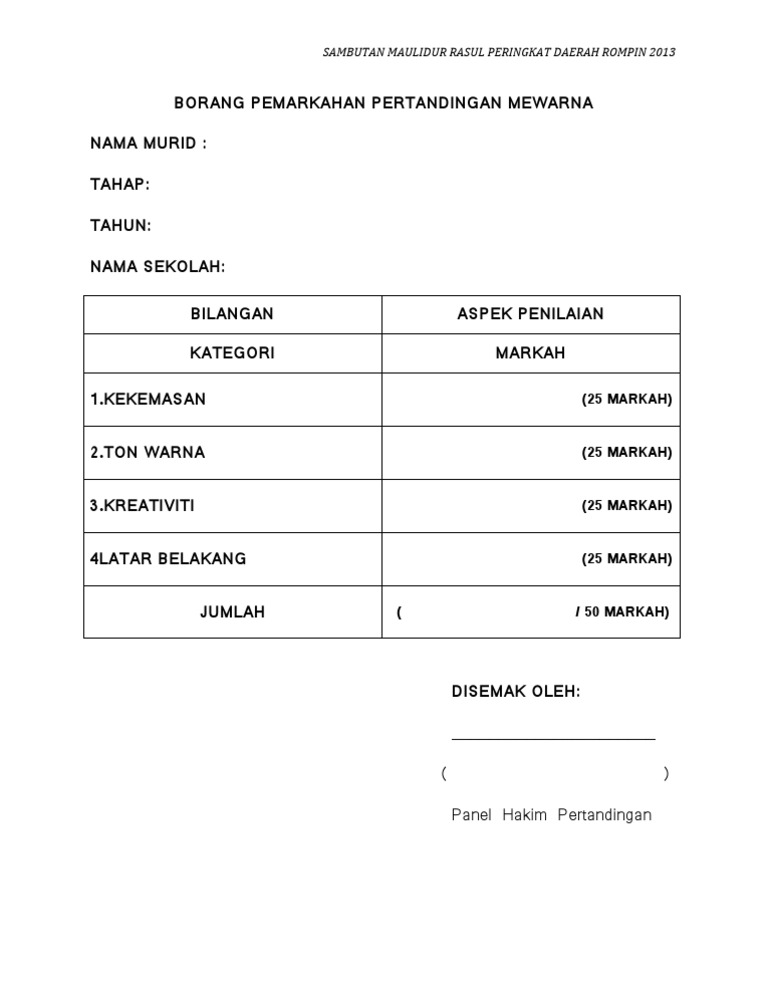 Contoh Borang Pemarkahan Pertandingan Mewarna Kanak Kanak