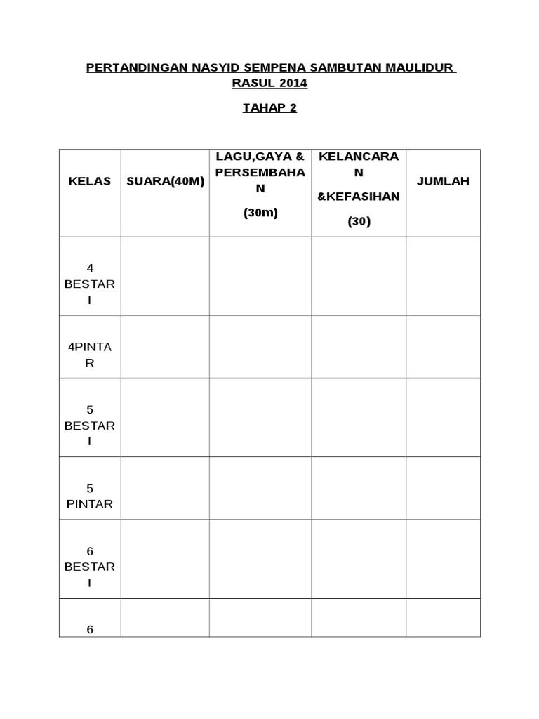 Contoh borang pemarkahan pertandingan nasyid. Koleksi buku cerita kanak kanak dalam bahasa arab. 6 2 2 mengedarkan borang penghakiman kepada para hakim. Festival nasyid dan pertandingan seni khat antara ipta ipts dan ipg sempena festival kesenian islam peringkat antarabangsa 1435h 2014m pada 26 29 september 2014 tempat institut pendidikan guru kampus batu lintang. Melalui pertandingan ini juga diharapkan dapat melahirkan insan yang berdaya saing berfikiran kreatif dan positif.