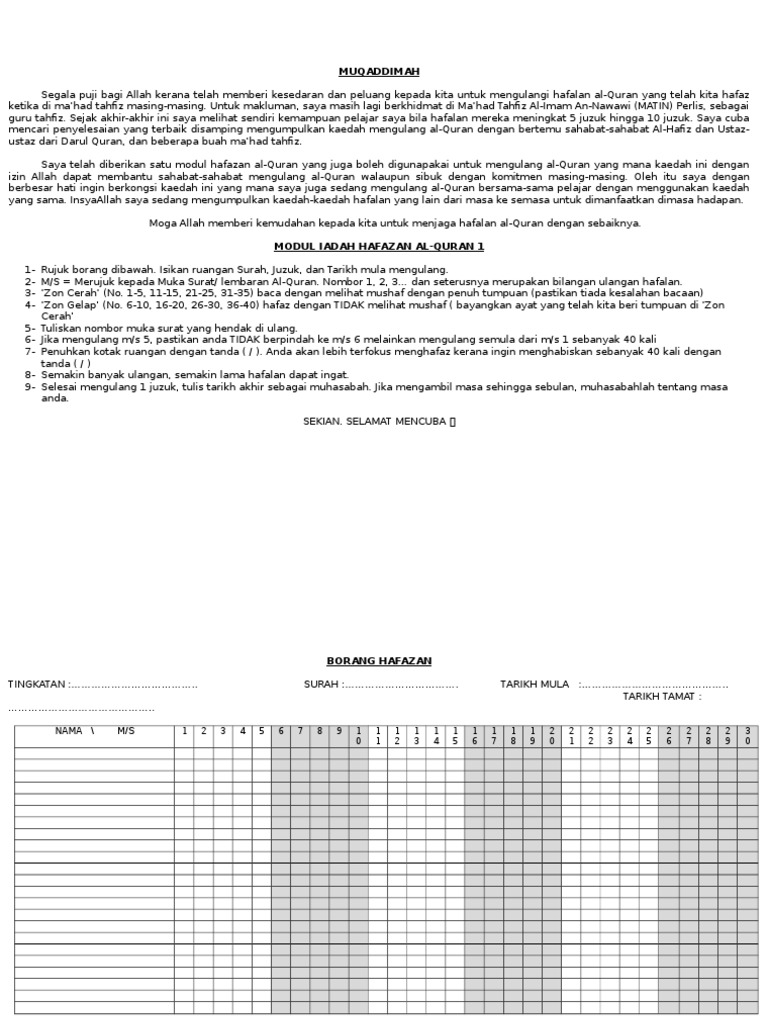 Contoh borang penilaian hafazan. Paling sedikit ada dua rekomendasi untuk peningkatan sistem yang dianggap signifikan dan dapat diterima oleh user dan disetujui oleh tim manajer. Ustazah noor aziah binti mamat kriteria yang dinilai kelancaran makhraj huruf keyakinan diri tajwid al quran jumlah. Hafazan band pernyataan standard deskriptor evidens pencapaian catatan band 1 tahu mengetahui asas membaca al quran hadis terpilih menghafaz surah tertentu mengetahui asas akidah ibadah adab sirah rasululllah saw dan jawi. Kriteria pemarkahan hafazan 1.