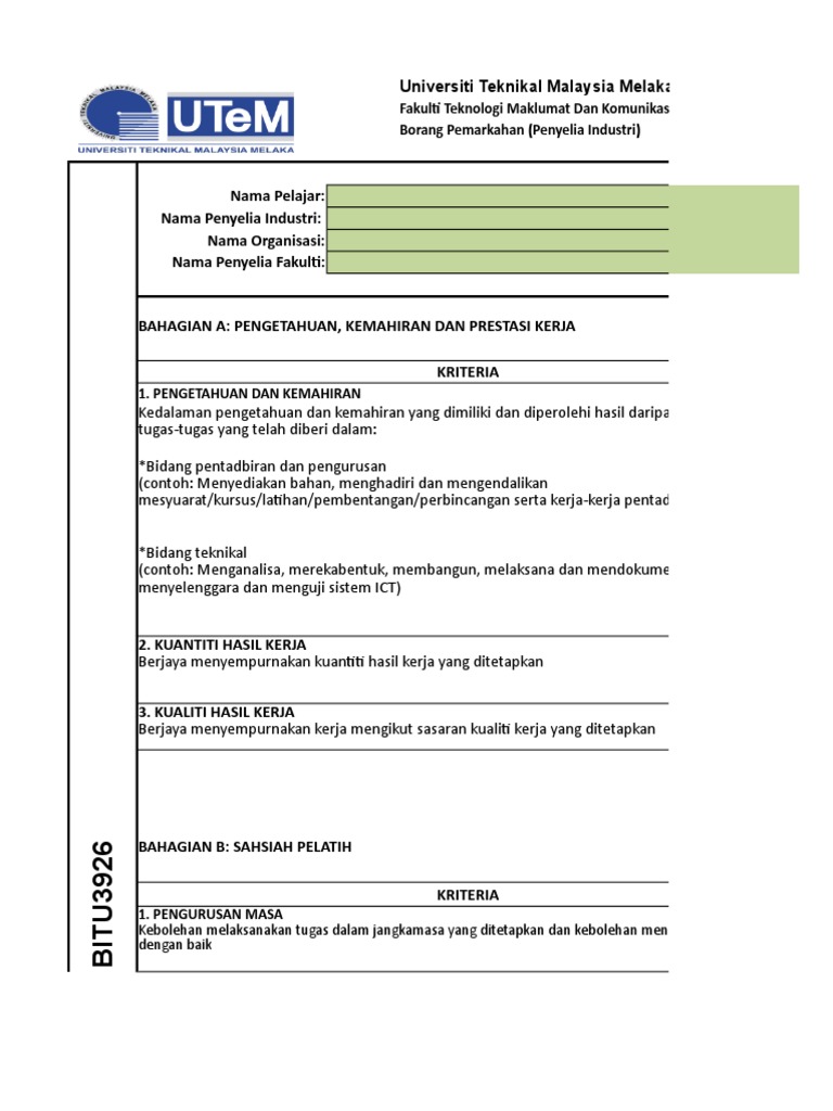 Contoh borang penilaian latihan industri. Muka hadapan laporan mengandungi a. Klik sini untuk melihat buku panduan latihan industri. Borang penilaian pensyarah penyelia. Garis panduan pelaksanaan latihan industri kolej komuniti edisi pelajar 3.