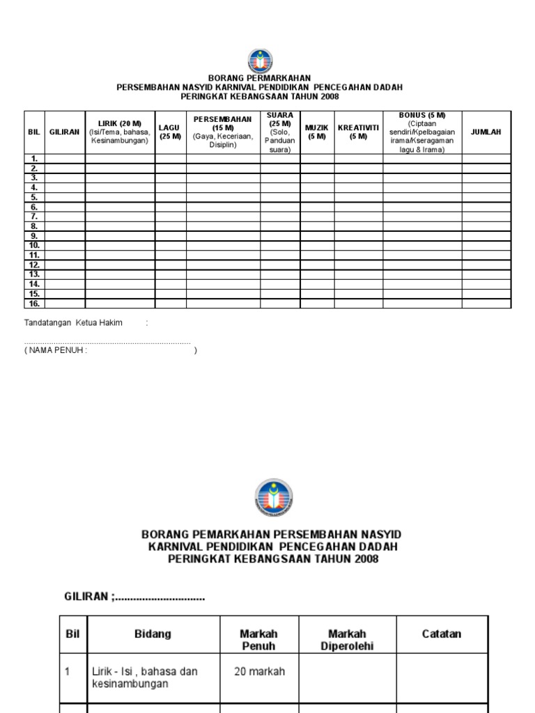Persembahan nasyid karnival pendidikan pencegahan dadah peringkat kebangsaan tahun 2008. Borang markah pertandingan tarian. Download borang pertandingan nasyid. Borang pemarkahan pertandingan nyanyian solo.