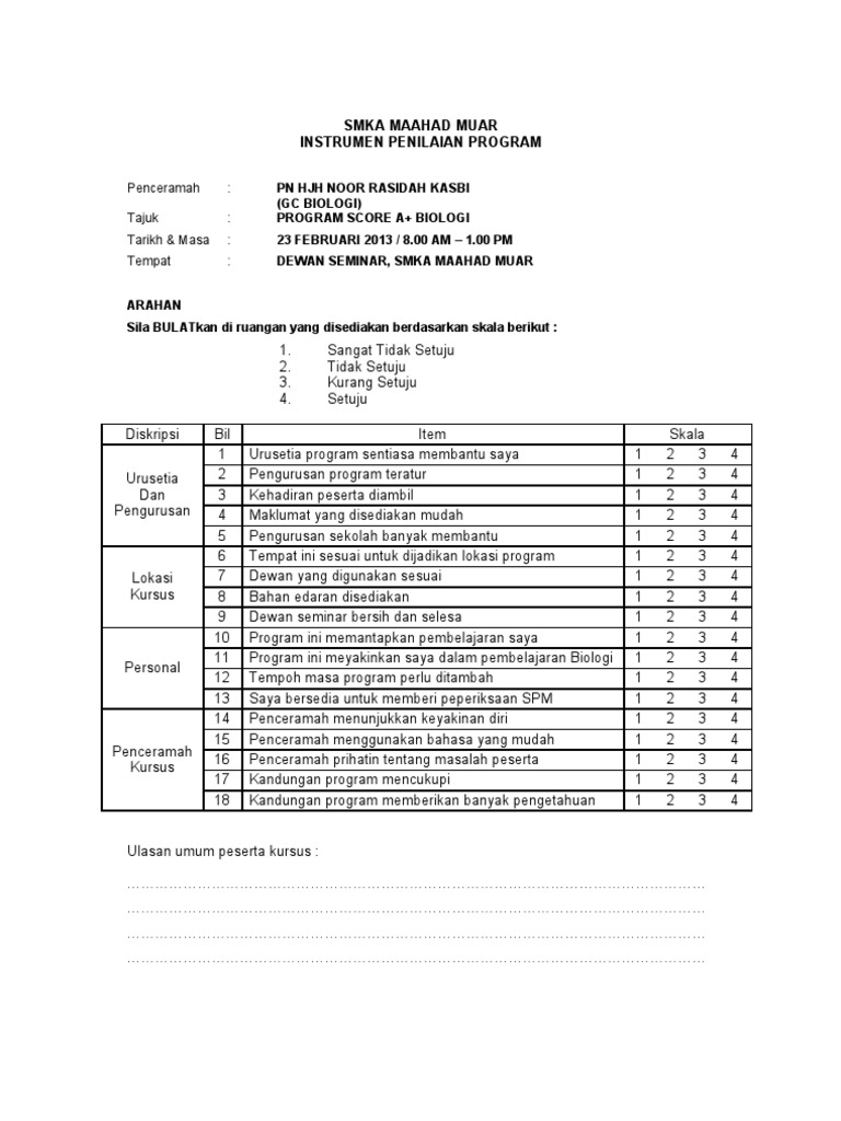 Contoh Borang Penilaian Peserta Kursus
