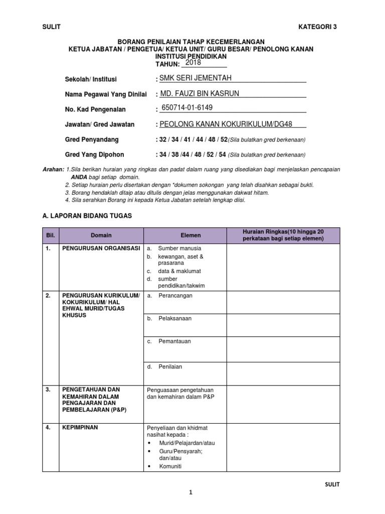 Sulit kategori 3 sulit 1 borang penilaian tahap kecemerlangan ketua jabatan pengetua ketua unit guru besar penolong kanan institusi pendidikan. Smk taman mewah nama pegawai yang dinilai tan wei leong no. Penolong pegawai daerah tanah m 48 penolong pegawai daerah pembangunan m 48 penolong pegawai daerah. Penilaian hendaklah dibuat di tempat bertugas semasa ppp.
