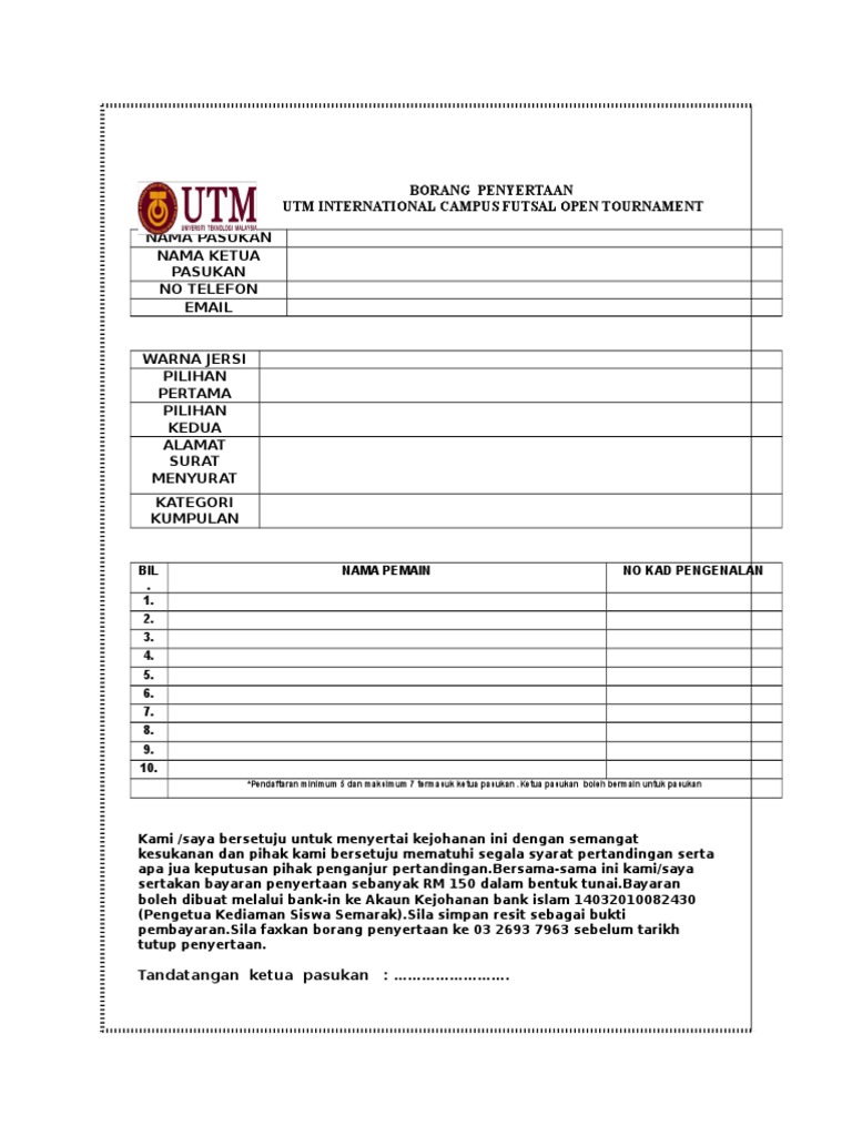 Contoh borang penyertaan futsal. Terbuka kepada warganegara malaysia berumur 16 50 tahun. Yuran penyertaan bagi setiap pasukan adalah rm160 00 bagi kategori terbuka lelaki. Amin azuddin samb. Borang penyertaan ini hendaklah dihantar tidak lewat pada tarikh tutup penyertaan yang dinyatakan.