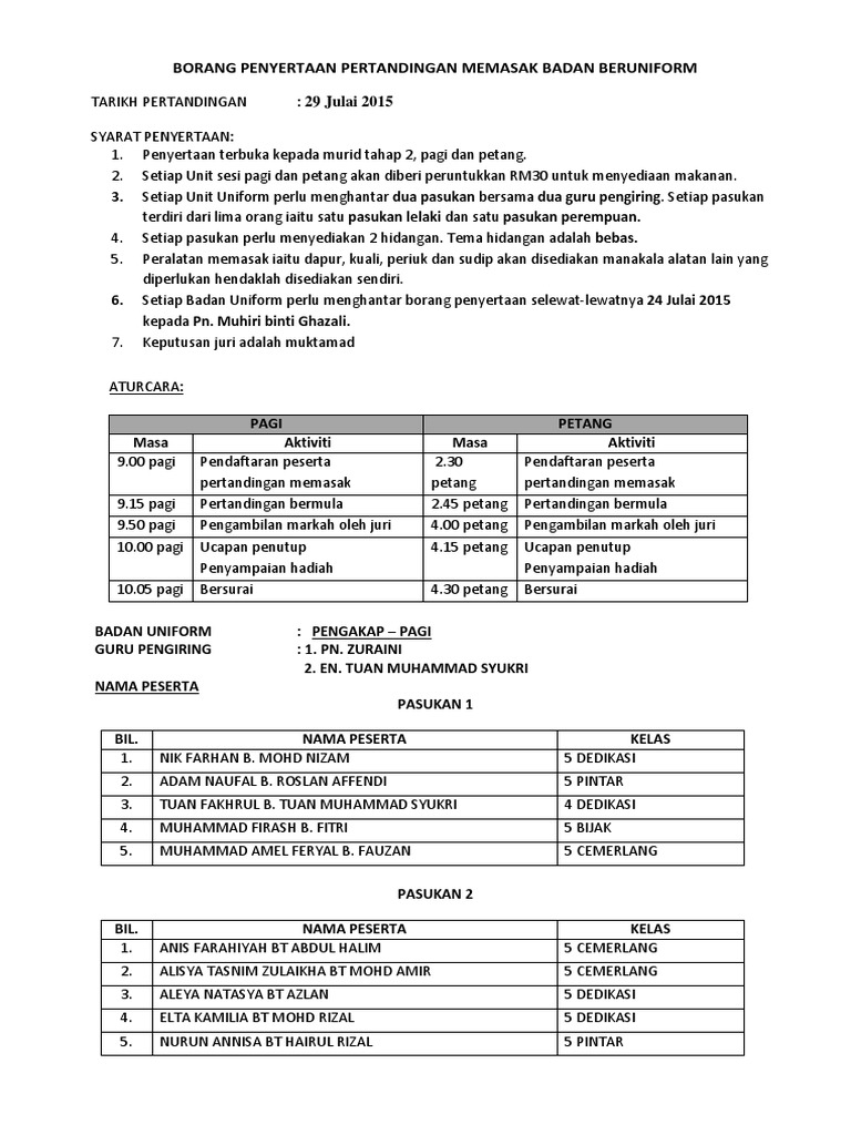 Okeylah yang bertanding ni bebudak sekolah yer setiap unit beruniforam hantar 6 wakil untuk memasak geng lain siapkan meja hidangan dengan teknik teknik ikatan nak bertanding kena la ada syarat dan sememangnya syarat tu untuk dilanggar betul tak. Dan tidak dibenarkan merokok makan dan minum di dalam dewan atau kawasan pertandingan. Borang penyertaan bagi pertandingan memasak secara langsung ikan gift tilapia air tawar terbuka kepada jabatan agensi persatuan kelab pada 24 oktober 2015 bersamaan hari sabtu sempena hari peladang penternak dan nelayan negeri sabah 2015 1 0 nama calon peserta 3 orang dalam 1 pasukan 1 1 ketua tukang masak nama peserta. Pertandingan futsal terbuka borang penyertaan.