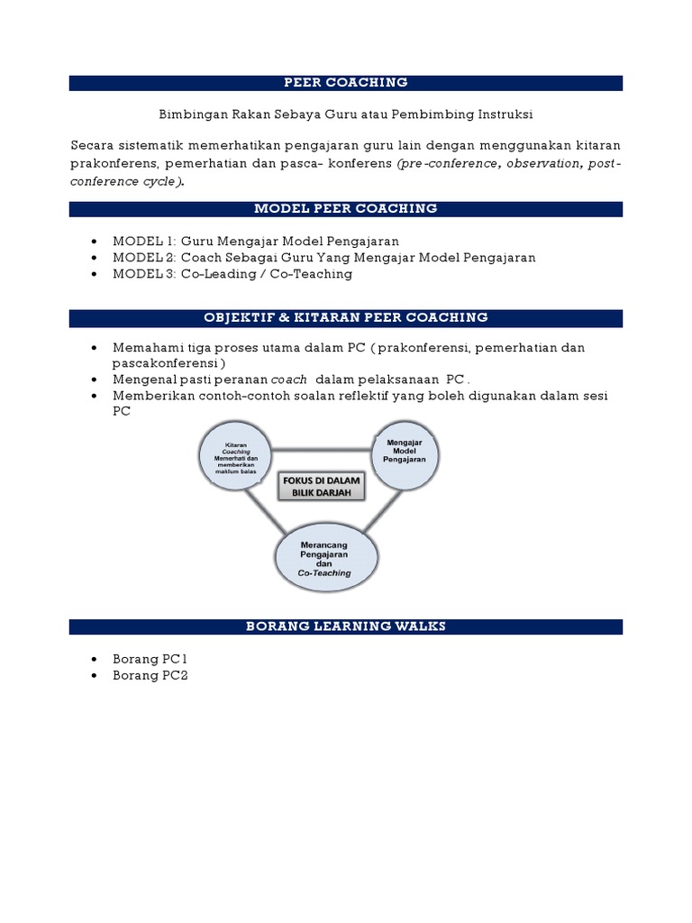 Contoh borang plc peer coaching. Setiap strategi plc lesson study peer coaching learning walk teacher sharing session video critique yang telah cikgu jalankan boleh didaftarkan sebagai tiga jam ldp. Pembimbing instruksi peer coaching full version pengenalan bimbingan rakan sebaya guru atau pembimbing instruksi peer coaching instructional coaches merujuk kepada strategi secara sistematik untuk memerhatikan pengajaran guru lain dengan menggunakan kitaran prakonferensi pemerhatian dan pascakonferensi. Peer coaching instructional coaches secara sistematik memerhatikan pengajaran guru lain dengan menggunakan kitaran pra konferens pemerhatian dan pasca konferens pre conference observation post conference cycle. Baru baru ini saya berpeluang berkongsi pengalaman di smk bawang assan.
