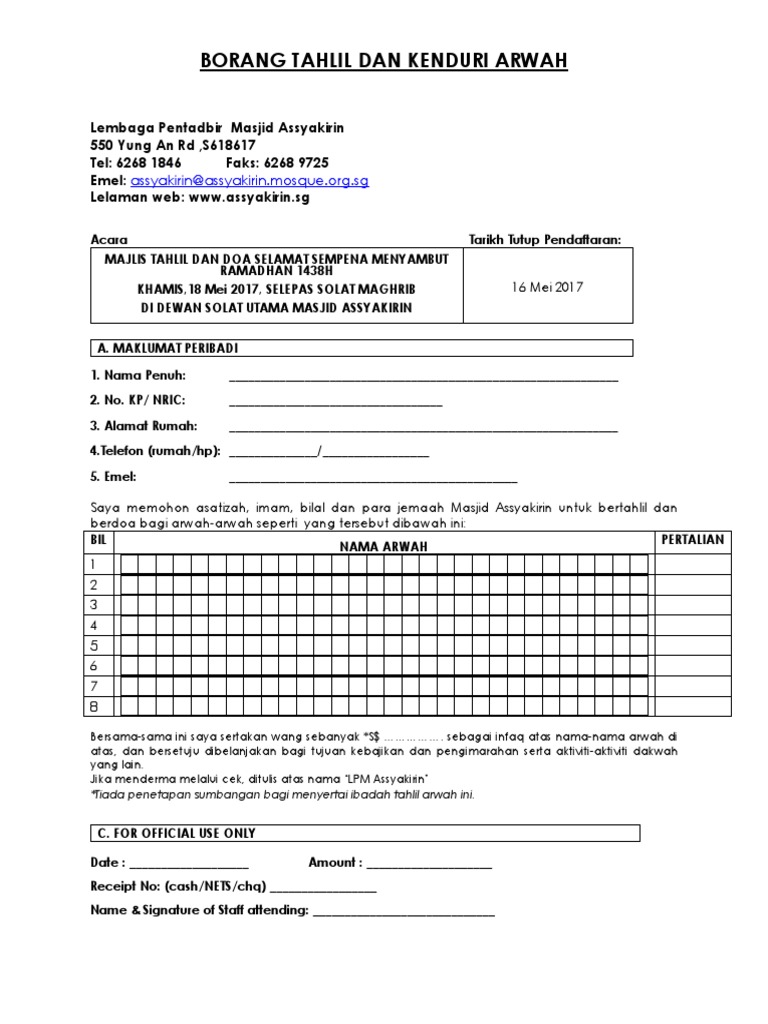 Doa pertama yang dibaca adalah doa tahlil setelah doa tahlil dibaca kemudian disusul dengan membaca doa setelah tahlil yang terdiri dari beberapa macam versi. Download borang sumbangan untuk surau tahfiz dan borang tahlil arwah sempena ramadhan 11 40 ptg aktiviti surau ad diniyyah ramadhan no comments barangsiapa yang memberi makanan berbuka bagi orang yang berpuasa maka baginya pahala yang seperti orang yang berpuasa tersebut tanpa mengurangi pahala orang yang berpuasa tersebut sedikit pun. Sila hubungi bilal pauzi tel.