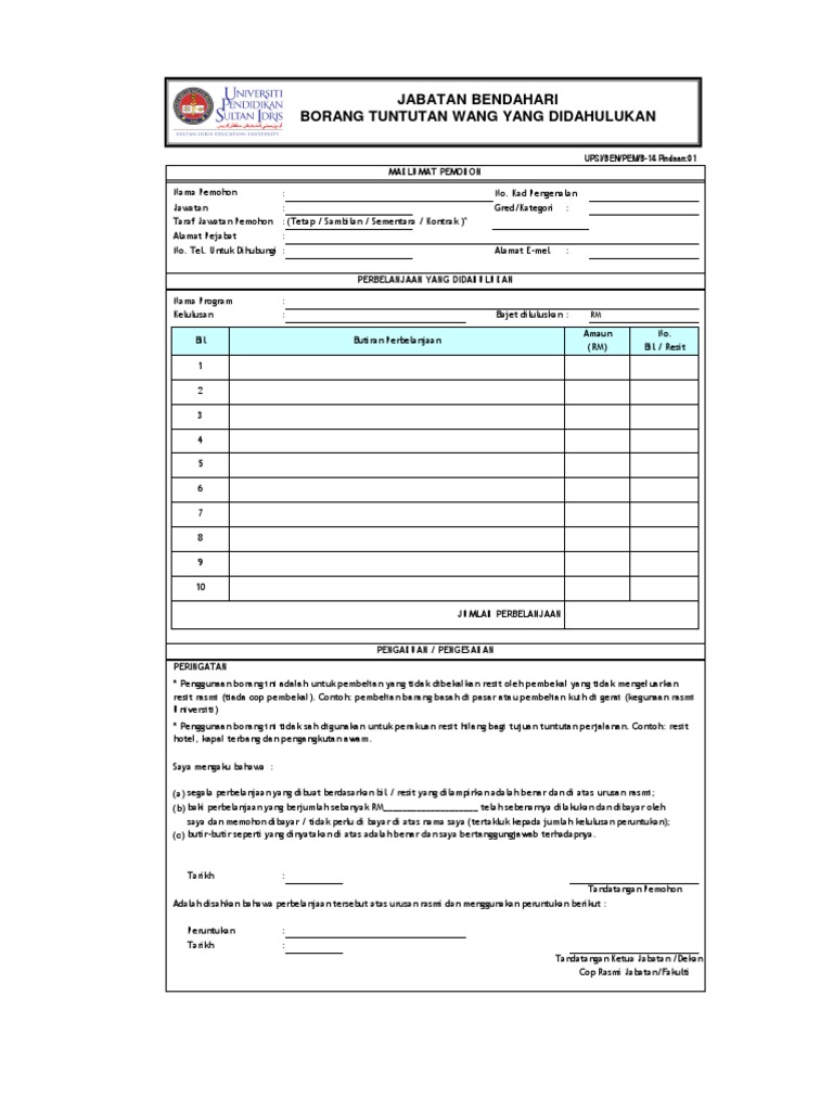 Resit butiran perbelanjaan jumlah rm catatan 1 jumlah perbelanjaan. Tuntutan perjalanan rasmi dan perpindahan diasingkan tuntutan perjalanan sambungan 3. Borang tuntutan bayaran staf bagi program aktiviti yang telah dijalankan perincian perbelanjaan sila isikan dengan lengkap dan lampirkan resit asal yang telah disahkan oleh dekan ketua jabatan bil no. Tarikh kemudahan perubatan diperolehi.