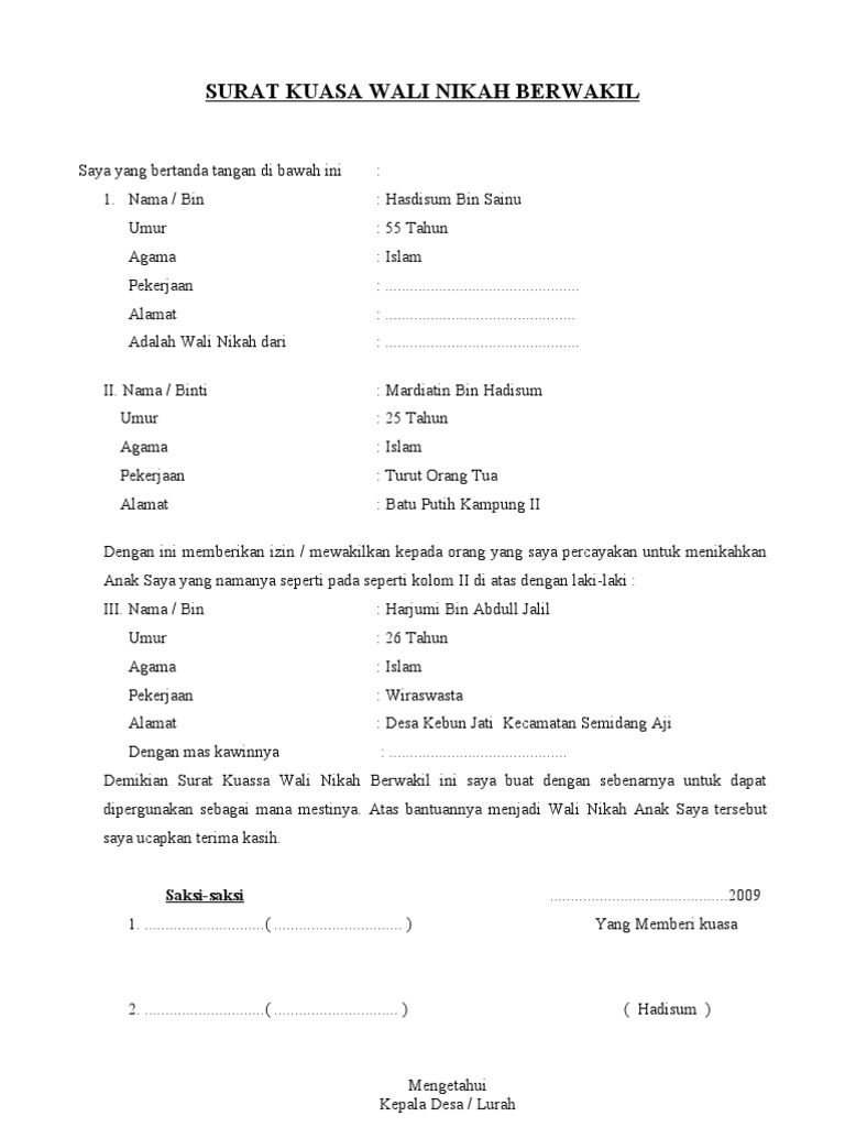 Kami luruskan pula bahwa sebutan wali nikah dari kua ini adalah wali hakim. Contoh surat permohonan wali hakim yang baik dan benar. Mohon maaf apabila terdapat kesamaan nama tempat informasi lain karena surat yang dibuat hanya bertujuan sebagai percontohan tanpa ada maksud apapun. Contoh surat keterangan wali nikah nasab hakim ع ن أ ب ي ب ر د ة ع ن أ ب ي م وس ى ق ال ق ال ر س ول الل ه ص ل ى الل ه ع ل ي ه و س ل م ل ا ن ك اح إ ل ا ب و ل ي رواه أحم.
