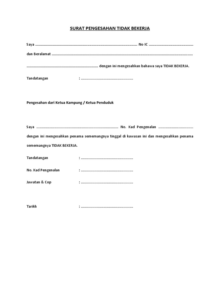 Surat pengesahan tidak bekerja. Mengesahkan bahawa penama di atas adalah ahli masyakat penduduk di kawasan pentadbiran saya dan berstatus tidak bekerja dan tidak mempunyai pendapatan. Panduan menulis surat pengesahan tidak bekerja pada 14 6 2015 jumlah. Contoh surat akuan pendapatan dibawah boleh dijadikan rujukan untuk meraka yang berkerja sendiri pengesahan pendapatan ibu bapa yang tidak bekerja pengesahan pendapatan ibu bapa untuk memohon ptptn mara dan sebagainya akuan penyata pendapatan pendapatan tidak bekerja dan lain lain lagi.