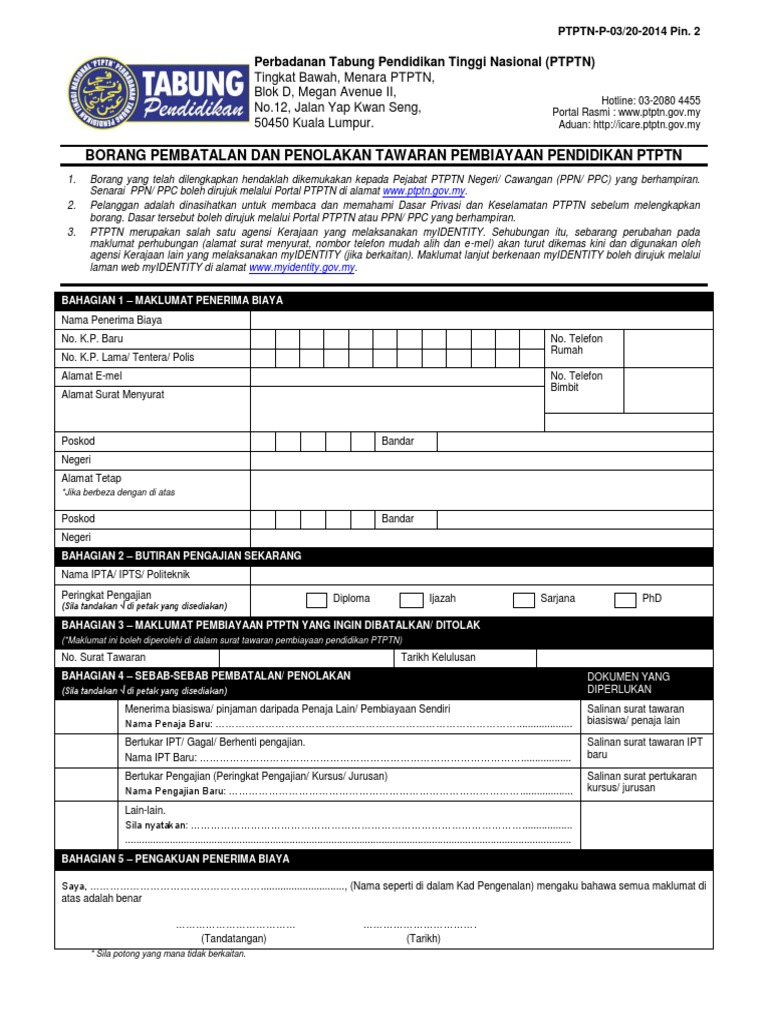 For enquiries kindly contact department of student affairs at 03 41450123 ext 3104 3343 obtain exemption of ptptn loan repayment application form download borang permohonan dan penerima biaya bagi pengecualian bayaran balik. Perbadanan tabung pendidikan tinggi nasional tingkat bawah menara ptptn blok d megan avenue ii no 12 jalan yap kwan seng 50450 kuala lumpur. Untuk membuat demikian anda perlu muat turun dan isi borang pembatalan dan penolakan tawaran pinjaman pendidikan ptptn. Perbadanan tabung pendidikan tinggi nasional tingkat bawah menara ptptn blok d megan avenue ii no 12 jalan yap kwan seng 50450 kuala lumpur.