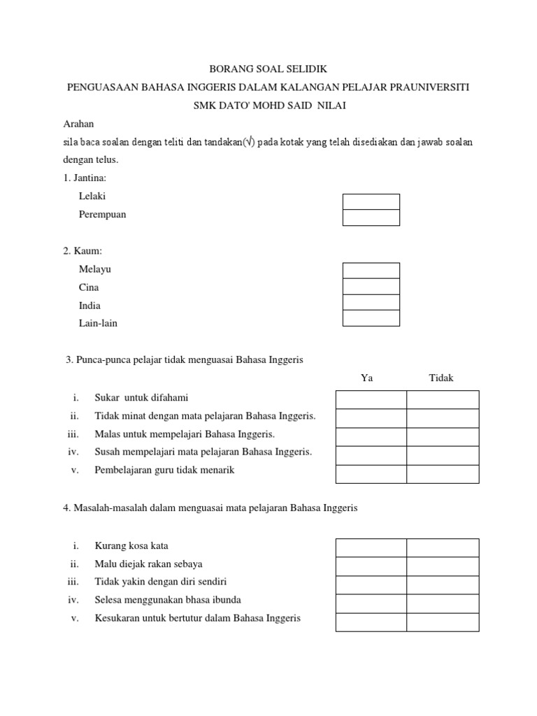 Maksud borang soal selidik dalam english. From professional translators enterprises web pages and freely available translation repositories. Contoh borang soal selidik seperti dalam. Borang soal selidik kajian mengenai kepuasan bekerja warga 2014. Sebanyak enam puluh tujuh soalan telah dibentuk yang terdiri daripada lima bahagian yang merangkumi imbuhan kata kerja bahasa arab dan juga imbuhan kata nama bahasa.