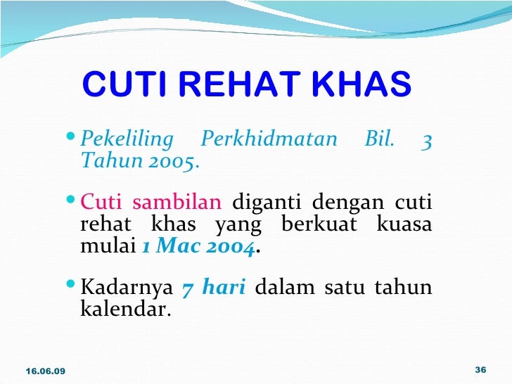 Pekeliling cuti rehat khas 2004. Jpa pen 228 43 8 5 no. Pada masa ini pelaksanaan cuti rehat khas kepada pegawai perkhidmatan pendidikan diperuntukkan di bawah pekeliling perkhidmatan bilangan 3 tahun 2005 dan surat jpa saraan s 63 51 8 jld 2 11 bertarikh 17 februari 2015. Published in waktu kerja cuti peraturan khusus sektor pendidikan perubatan keselamatan read 3339 times. Sepanjang perkhidmatan seseorang pegawai jumlah keseluruhan cuti rehat khas dan cuti rehat yang dibenarkan untuk dikumpul bagi tujuan pemberian wang tunai gantian cuti rehat hendaklah tidak melebihi 120 hari.