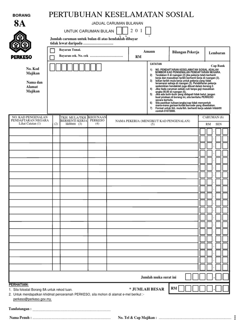Salinan borang 8a perkeso. Karusel sebelumnya karusel berikutnya. Slip bayaran bank dan salinan borang 8a perlu disimpan oleh majikan bagi tujuan rekod. I c aduan anda hantar ke 15888. Pertubuhan keselamatan sosial perkeso tidak akan mengeluar dan mengedarkan borang bayaran caruman bulanan atau dikenali sebagai borang 8a secara manual kepada majikan bermula 1 januari depan.