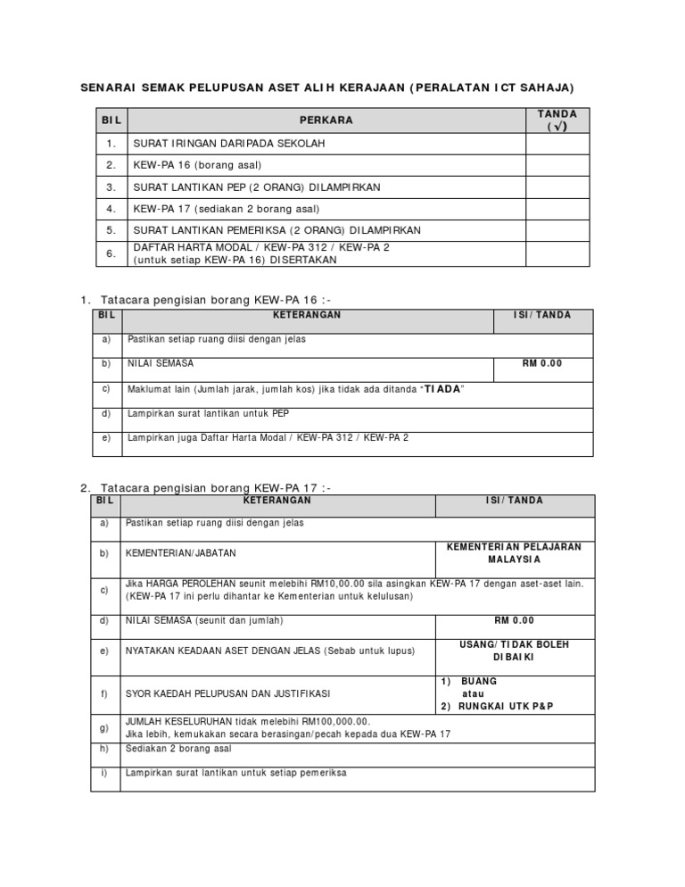 Tatacara pengurusan aset alih kerajaan kp 2 2013 senarai kandungan kp2 1 pendahuluan. 6 2 semua aset alih yang dicadangkan untuk pelupusan hendaklah disenaraikan di kew pa 21. Pelupusan aset tak alih kerajaan laporan pemeriksaan dan penarafan aset tak alih bab e penilaian keadaan prestasi aset. Penyediaan pelan pemulihan ubah suai naik taraf aset bajet 2.